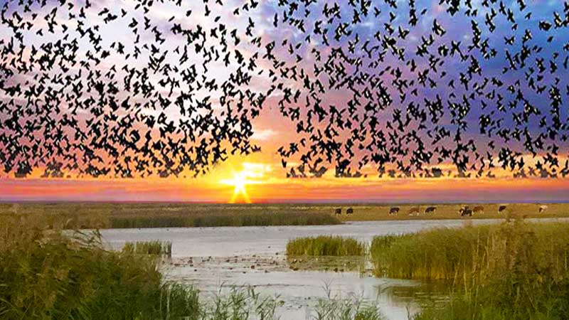 3 dags tur til Sønderjylland og Marsklandet hvor vi skal opleve sort sol. Som ved et trylleslag letter stærene, de kommer fra alle 4 verdenshjørner – den ene flok efter den anden. Enorme flokke bølger hen over himmelrummet. Flokke på op til 250.000 fugle flyver, som om de kan koordinere deres flyvning perfekt. I løbet af 20 minutter opføres ”Sort Sol” og helt utrolige formationer ses på himlen. Det kan ikke beskrives i ord eller billeder, det skal ses, det er en oplevelse, man aldrig glemmer. Lige så pludselig, som det hele startede, er det forbi igen. Stærene har sat sig til ro i tagrørene, nu venter de på, at det bliver lyst igen. Hvad enten man vil opleve marsken, de store fugletræk eller fornemme tidevandets unikke rytme ved Højer Sluse og Ballum Sluse, får man naturoplevelse i særklasse. Og så kan man jo kombinere det med at opleve masser af andre seværdigheder bl.a. besøger vi den gamle købstad Ribe og dens Domkirke samt ophold i Tønder og grænsehandel. m.m.
